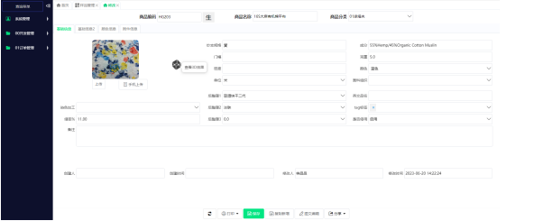 1,樣品檔案管理系統(tǒng),保存布的基礎(chǔ)信息(門幅、密度、成分、經(jīng)紗緯紗、織造工藝、后整理工藝)、圖片和成本信息,同一款樣布打印不同樣式的樣品標(biāo)簽。
