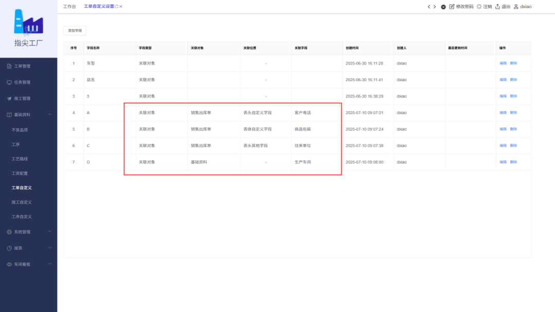 2、工單自定義字段,支持關聯【天通ERP S系統】里的基礎資料(生產車間、往來單位)。