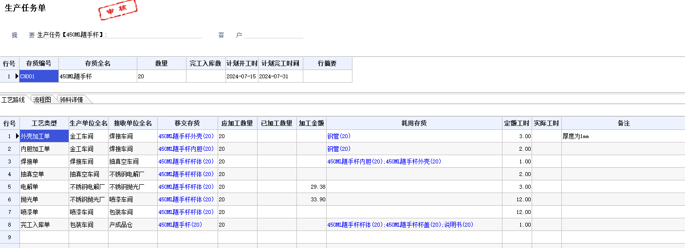 數字化軟件可以在制定生產工藝路線的基礎上依據生產計劃生成生產任務單。生產任務單中包括了所需物料、生產數量、生產工藝路線、工序計劃、生產周期等信息。生產任務單在制造業中具有非常重要的作用,它是生產過程中的核心文檔,直接確定了生產過程、工藝要求、生產物料配置和費用構成要素等內容。