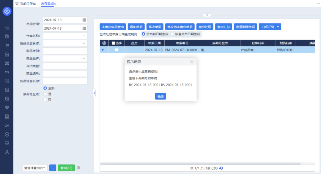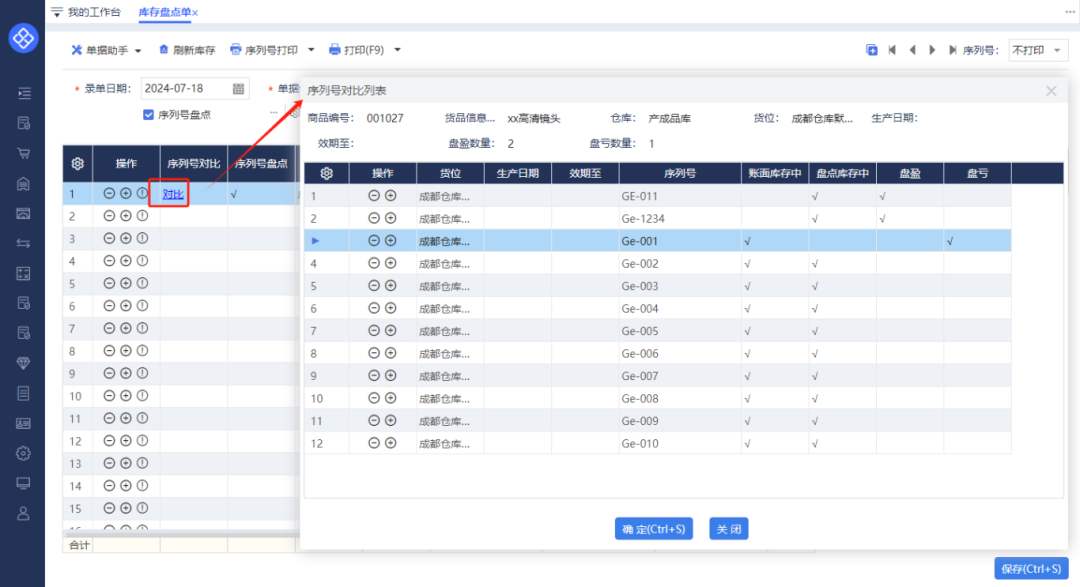 軟件在進(jìn)行盤點(diǎn)處理(盤點(diǎn)匯總)的時(shí)候,不再使用數(shù)量作為判斷依據(jù),而是使用賬面庫(kù)存中的序列號(hào)和盤點(diǎn)單中的序列號(hào)進(jìn)行序列號(hào)之間的判斷,生成對(duì)應(yīng)的報(bào)損單或報(bào)溢單。