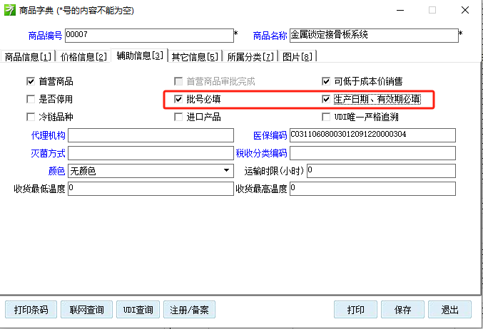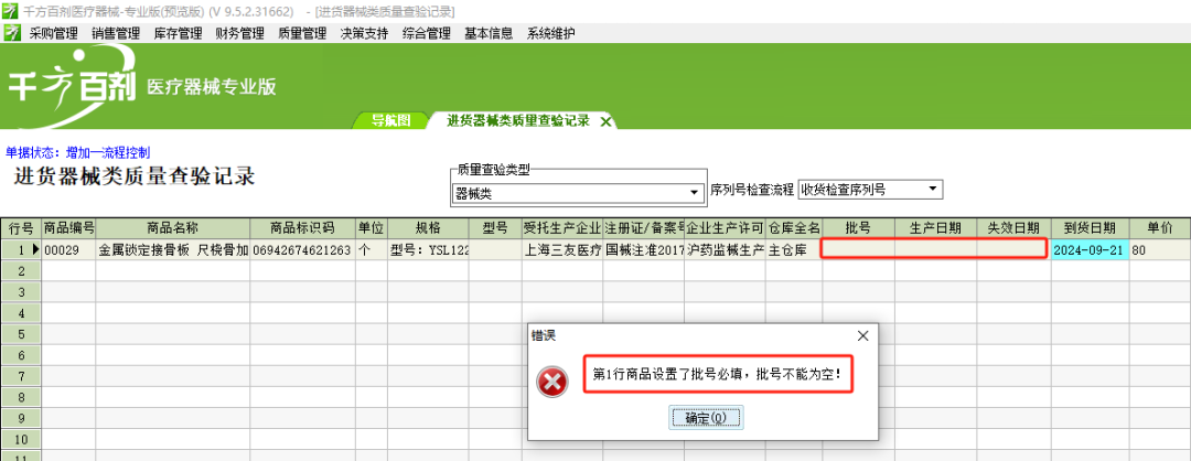 為此類防范風險,千方百劑器械版為藥房等醫療器械銷售終端提供了強有力的合規保障。系統在建立醫療器械產品檔案時,啟用批號、生產日期和有效期必填,進貨查驗入庫時系統會強制必須錄入批號、生產日期和有效期等關鍵信息,否則系統將無法收貨入庫,防范此類風險。