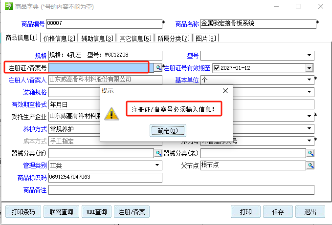 針對此類風險,千方百劑呼吁所有藥業公司及二類器械公司將合規視為經營的生命線。為實現這一目標,推薦采用千方百劑器械版,該系統集成了UDI掃碼與信息自動填充的便捷功能,并特別強化了醫療器械注冊證的管理,將其設為必填項。在建立商品檔案的過程中,系統嚴格要求錄入醫療器械注冊證信息,以此確保關鍵信息的完整性和合規性,為企業的安全經營奠定堅實基礎。