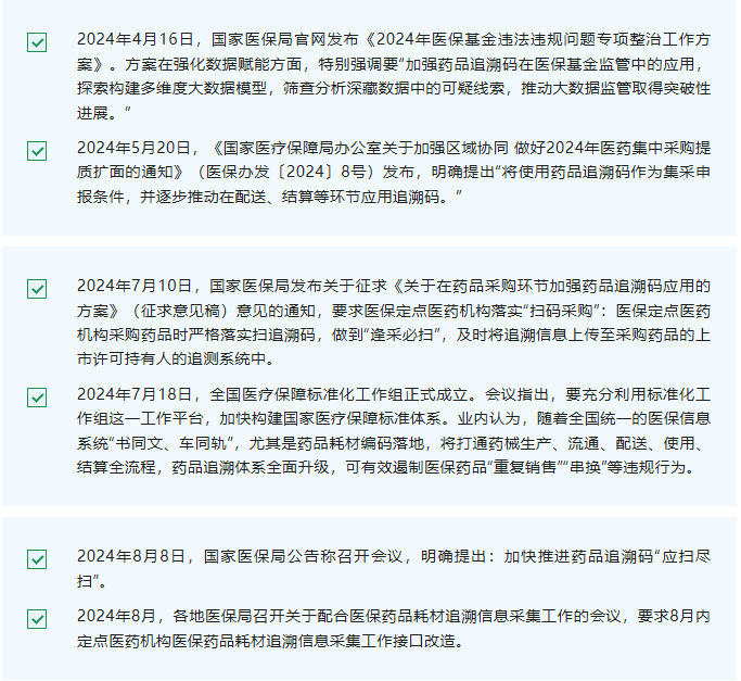 2024年,國家藥監部門和醫保局在藥品追溯碼管理方面邁出了重要步伐。這些政策要求: