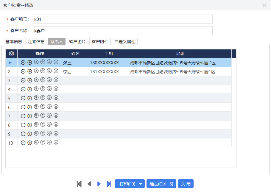 在客戶檔案的“聯(lián)系人”中,可添加多個聯(lián)系人,每個聯(lián)系人包含姓名、手機和地址。操作員可調(diào)整聯(lián)系人順序,系統(tǒng)將默認(rèn)將排序第一的聯(lián)系人信息帶入單據(jù)。