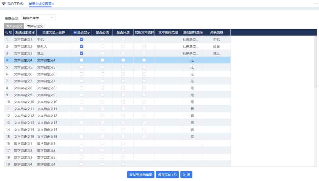 在銷售出庫單表頭啟用自定義字段,從“基礎(chǔ)資料選擇”中關(guān)聯(lián)往來單位,并指定需要調(diào)用的對應(yīng)字段(如手機、聯(lián)系人、地址)。