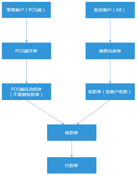 門店提交采購訂單--系統自動通過采購訂單生成銷售訂單,由中心倉審核--中心倉庫審批銷售訂單后,轉化成銷售出庫單,完成商品出庫--系統自動將銷售出庫單生成門店的采購入庫單,門店確認數量進行驗收--門店做付款單向中心倉進行付款--系統根據門店的付款單自動生成收款單,由中心倉確認收款金額,完成收款。